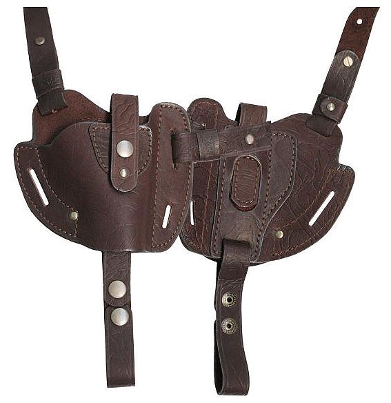 Кобура универсального назначения выполнена из коричневой кожи. Благодаря точной формовке пистолет уютно погружается внутрь. В качестве застежки используется ремешок с кнопкой. С помощью подвесной системы кобуру можно носить на плече.